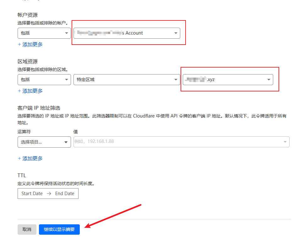 划到页面最底下,在 账户资源 中选择你的账号,在 区域资源 中选择你想要使用的域名,选择好后点击最底下的 继续以显示摘要 :