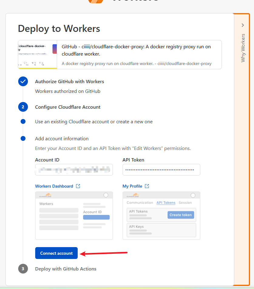 首先在浏览器中登陆你的 Github 账号,然后打开 ciiiii/cloudflare-docker-proxy 项目,点击 Deploy with Workers 按钮: