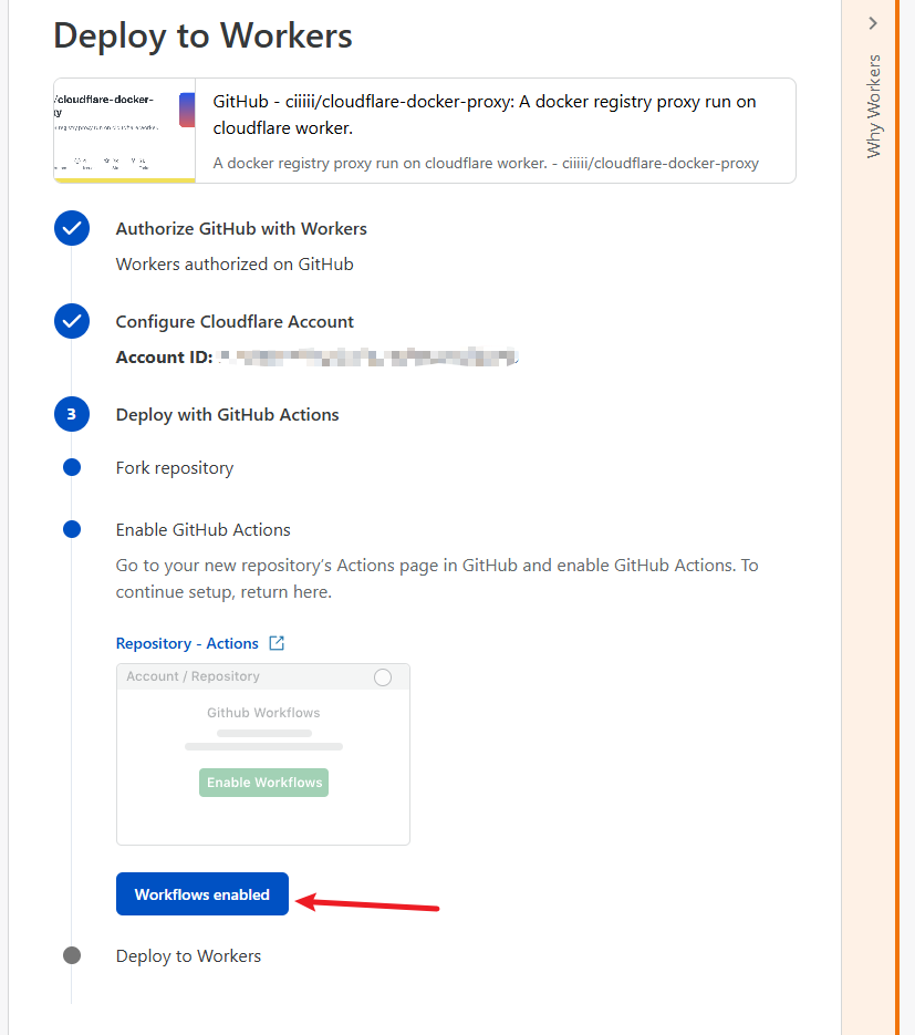返回刚才创建 Workers 的页面,点击 Workflows enabled :