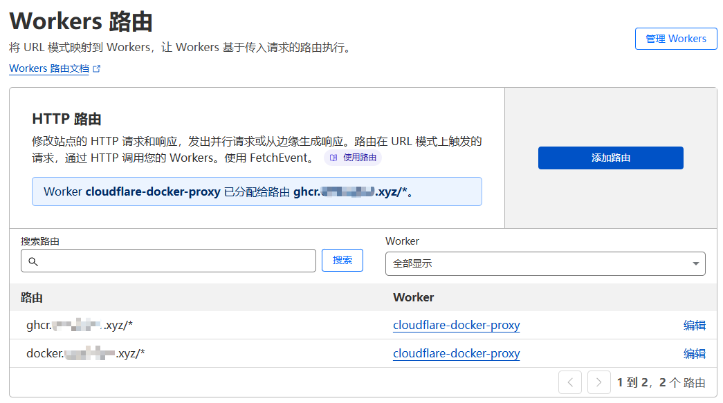下面的 Worker 选择刚才创建好的 Worker ,上面的 路由 输入 docker.你的域名/* (例如 docker.example.com/*),最后点击 保存 :