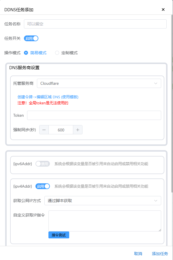进入 Lucky 的后台,点击左边的 动态域名 ,再点击上面的 添加任务 。任务名称 随意,托管服务商 选 Cloudfalre, Token 输入你的域名的