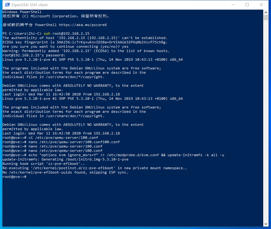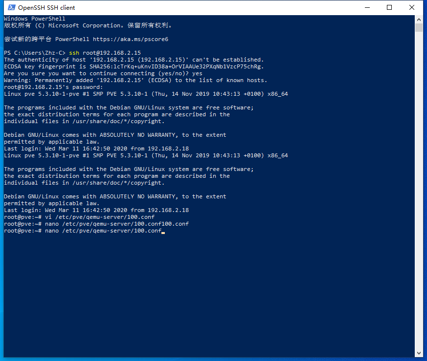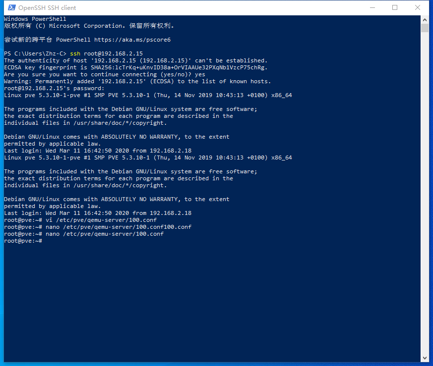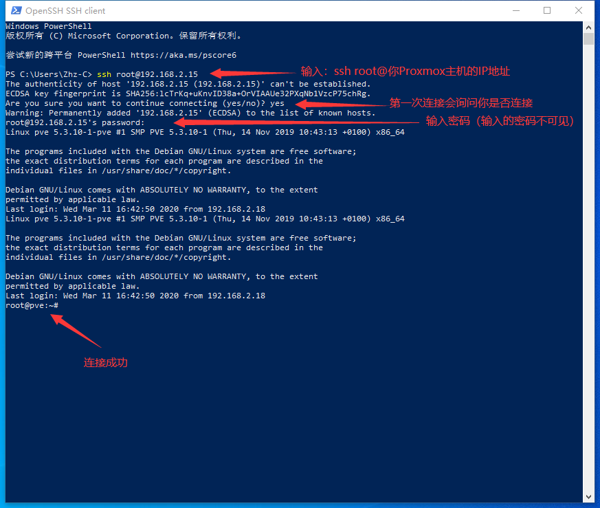 然后打开PuTTY,CMD,PowerSell 或 MobaXterm 来连接 Proxmox 。账号为 root,密码为你安装 Proxmox 时设置的密码。我这里使用 PowerSell 来连接:
