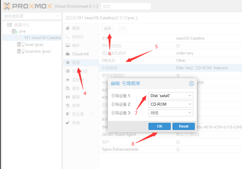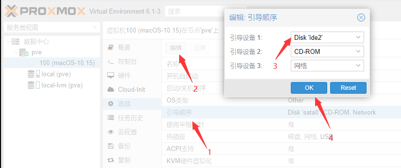 回到 Proxmox 控制台,点击 选项,把 ide2 设置为第一启动项(即装载 Clover 引导镜像的 CD 驱动器):