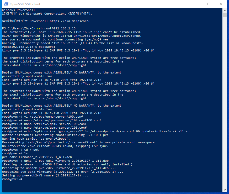 然后把 pve-edk2-firmware_2.20191127-1_all.deb 这个文件上传到 /root 目录,再 cd 到 /root 目录,输入 ls,即可看到刚才上传的文件: