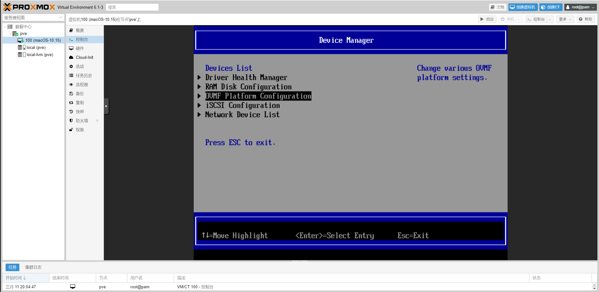 开启虚拟机,并快速回到 控制台 选项卡,点击 Esc 进入 OVMF 设置。如果没有进入到 OVMF 设置,请重启虚拟机并再试一次: