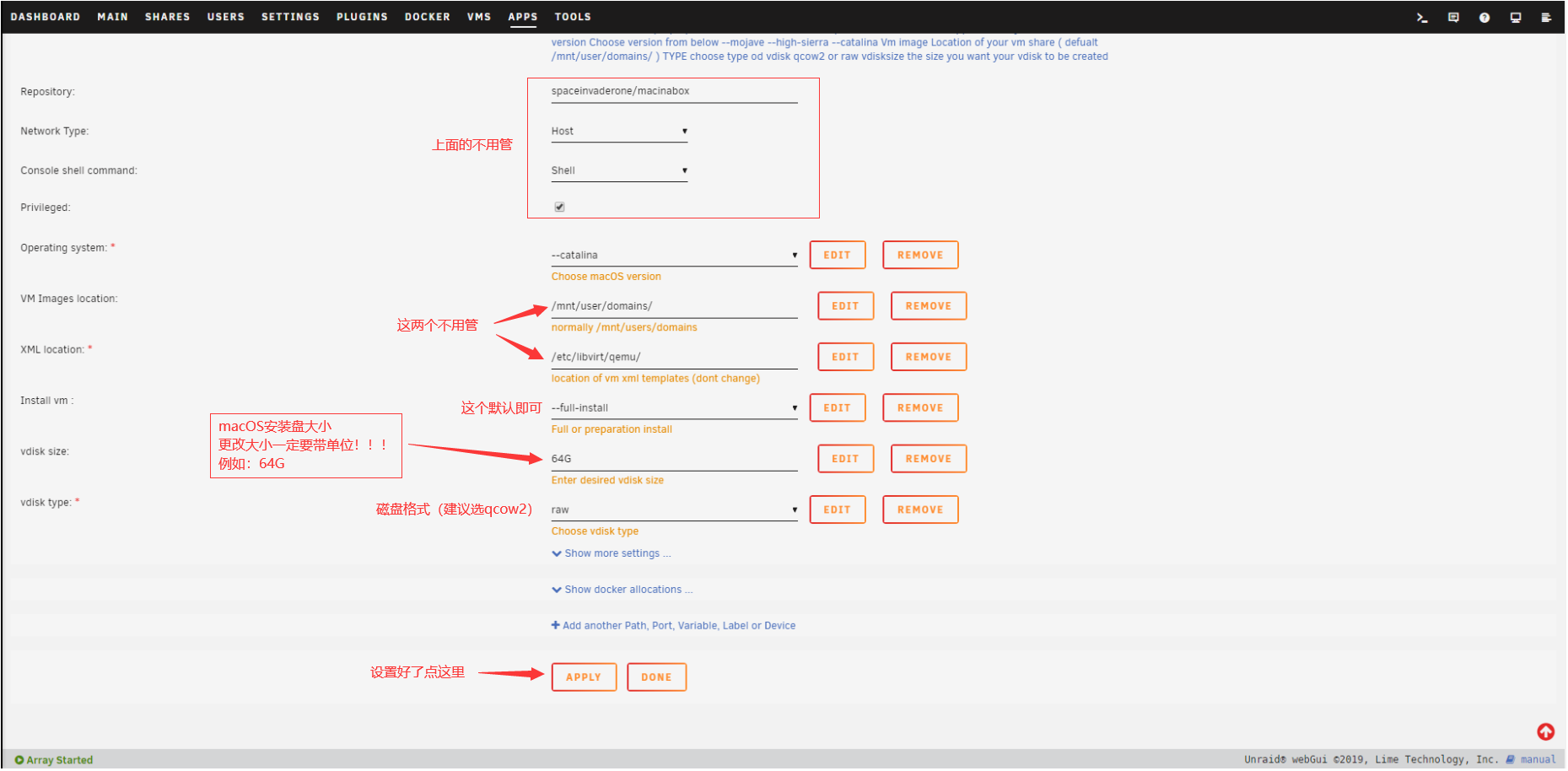 这里本应该还有一张图片的,但因为本人安装 unRAID 的机器出了点问题,所以没有截图。大体的内容就跟安装其他 Docker 应用时的页面一样。